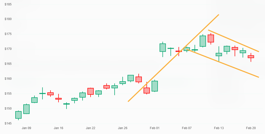 Since the consolidation was preceded by a price surge, traders might anticipate that the stock price will resume its climb if it either breaks upward out of the flag pattern (a breakout), or if it reaches the bottom trendline of the flag pattern (bounce off support).