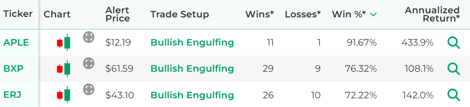 You can find them by using our Bullish Engulfing Pattern scanner. It's a free tool we offer here at Stock Market Guides. It uses our proprietary scanning technology to find stocks that just had a bullish engulfing candlestick pattern on a daily chart.