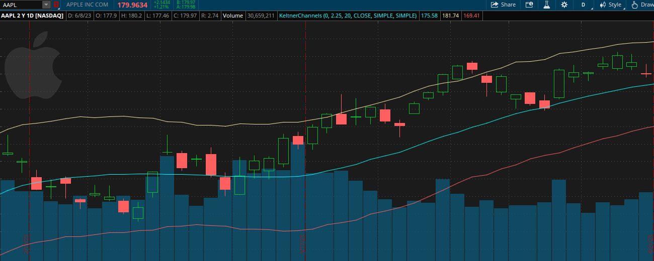 That suggests the upward trend might be a strong one. In other words, you can compare the stock's price activity to the Keltner lines to understand how strong a trend might be.