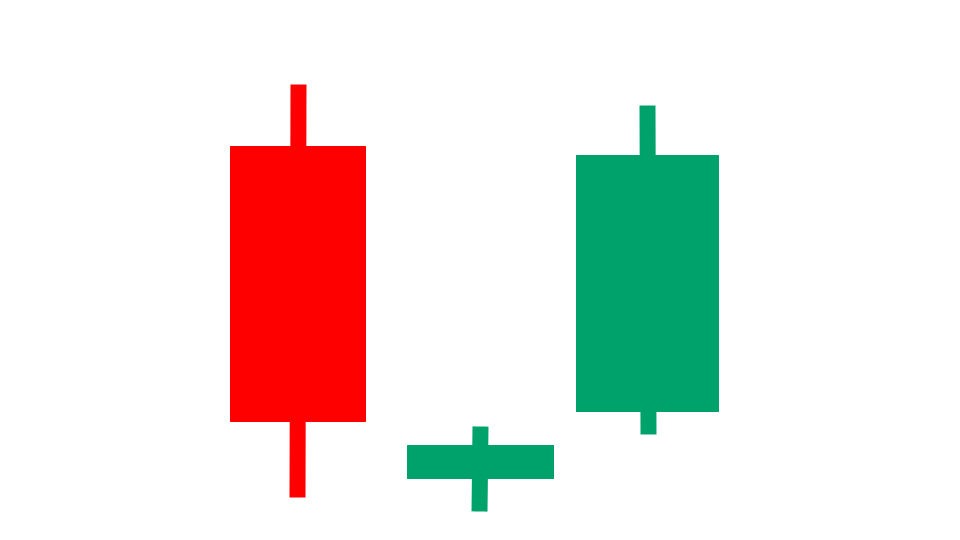 You can see the first candle is a tall red candle. The second candle is a red doji candle that opened beneath the first candle. The third candle is a tall green candle.