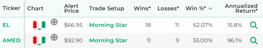You can find them by using our Morning Star Pattern scanner. It's a free tool we offer here at Stock Market Guides. It uses our proprietary scanning technology to find stocks that just had a morning star candlestick pattern on a daily chart.