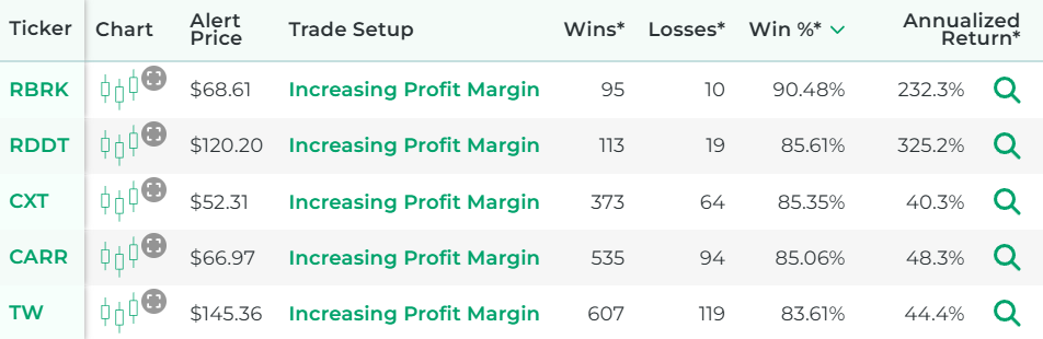 You can find them by using our Increasing Profit Margins scanner. It's a free tool we offer here at Stock Market Guides. It uses our proprietary scanning technology to find stocks that have increasing profit margins.