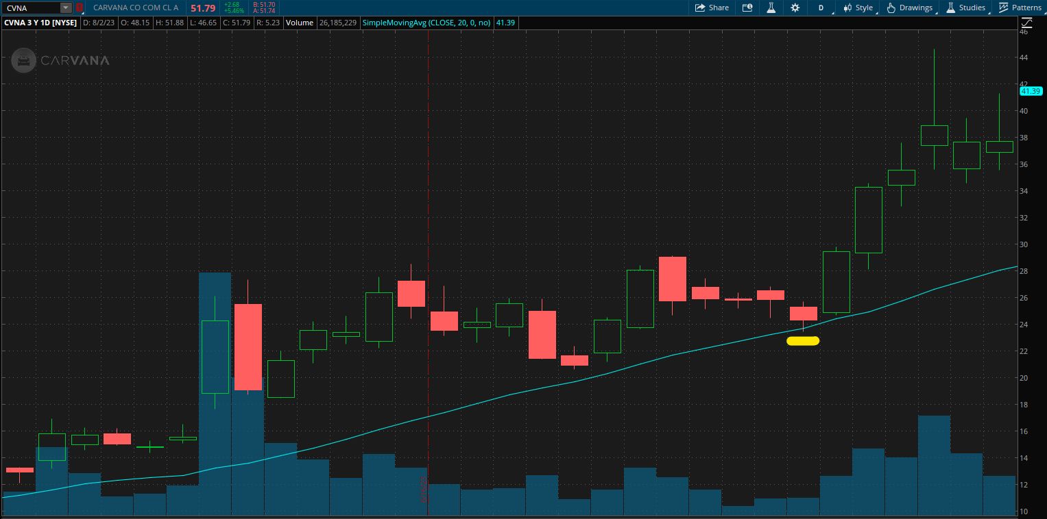 That image shows a stock chart for Carvana. The blue line on the chart represents the 20-day Simple Moving Average.