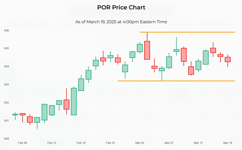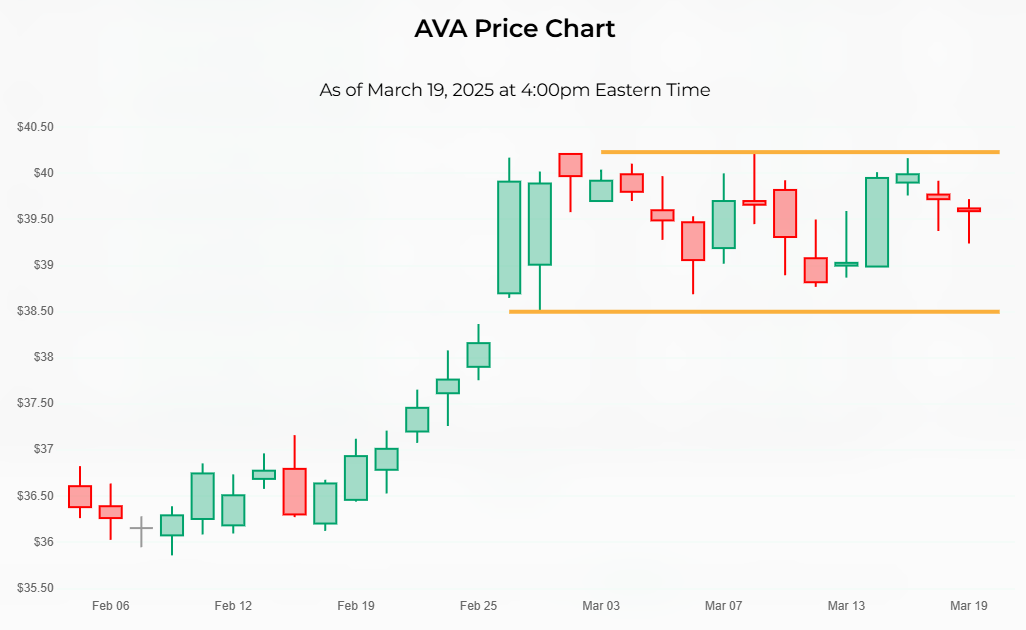 The entry criterion for our Channel Pattern trading strategy is very simple. You can see in the stock chart below for Avista that the entry price would be right above $40, where that upper golden line is.