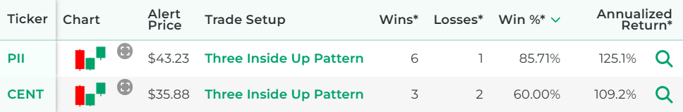 That tool ensures that you don't have to waste time flipping through stock charts manually to find stocks with a three inside up candle pattern.