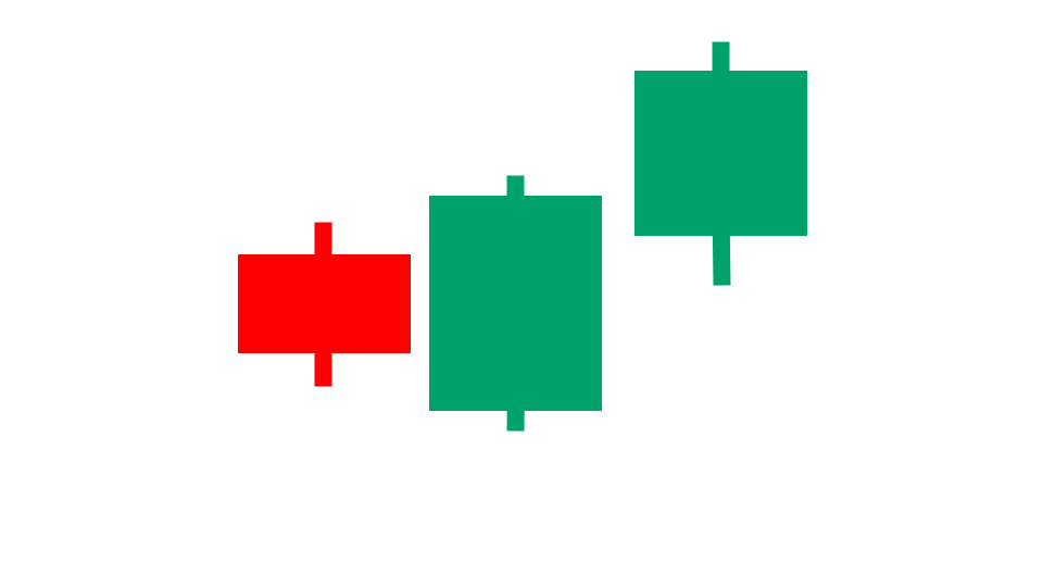 - Third candle - The third candle is another green candle that breaks the high price of the second candle.
