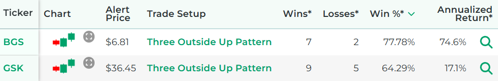 That tool ensures that you don't have to waste time flipping through stock charts manually to find stocks with a three outside up candle pattern.