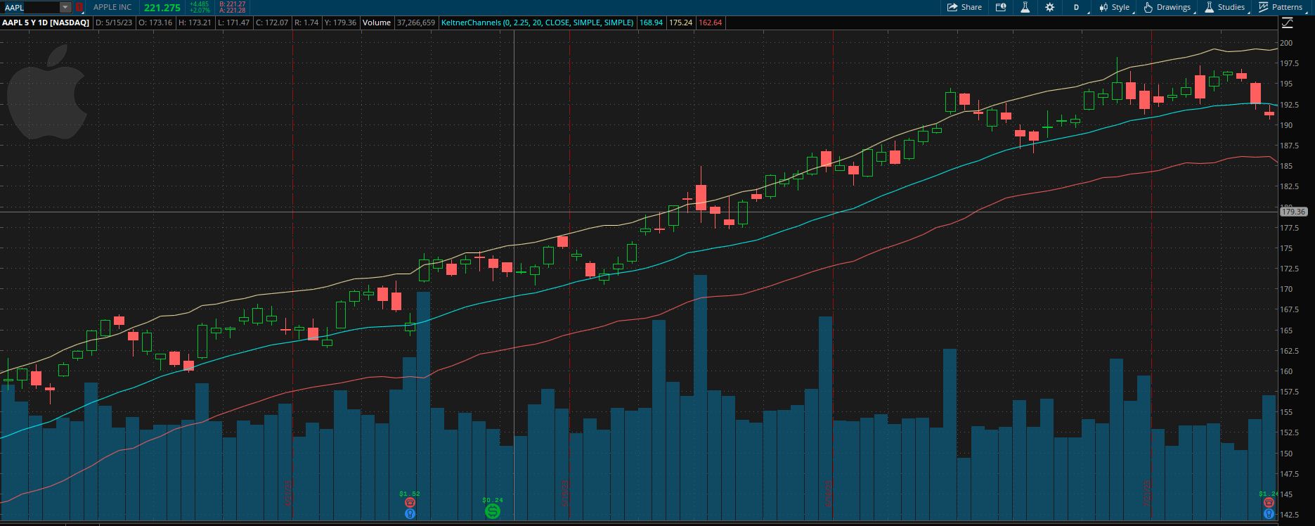 As you can see, there is some discretion for how you frame or define an uptrend when looking at a stock chart, but a Keltner channel can help clear this up.