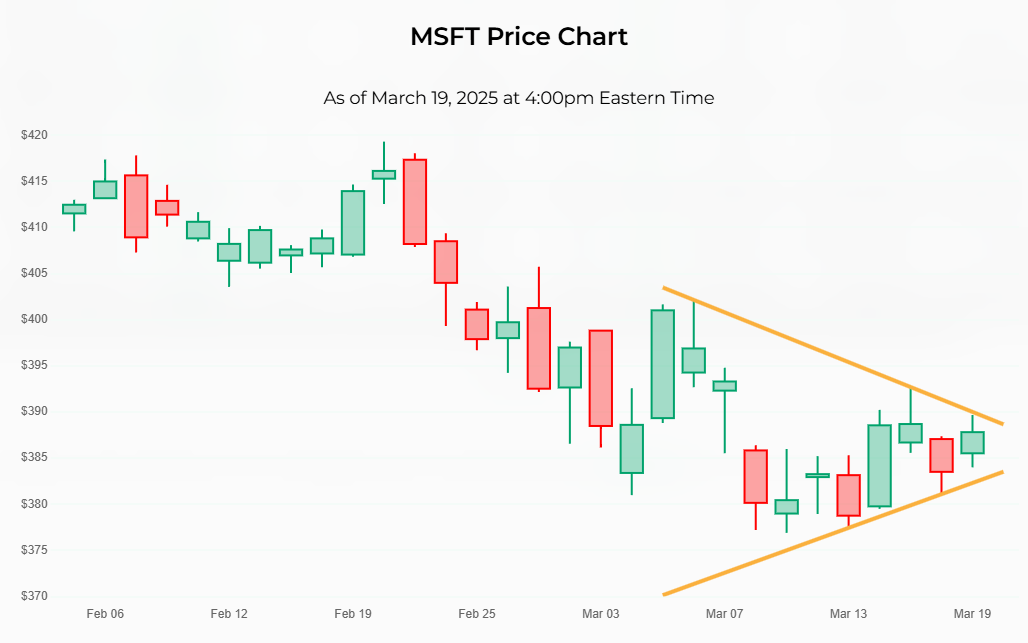 The entry criterion for our Wedge trading strategy is very simple. You can see in the stock chart below for Microsoft that the entry price would be right around $388, where that upper golden line is.