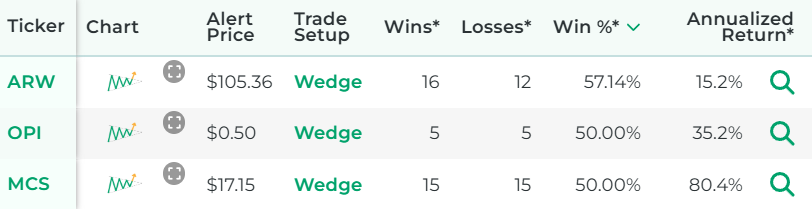 The answer is that trades based on a wedge are not always profitable, but for certain stocks they might indeed have a track record of success according to our backtest research.