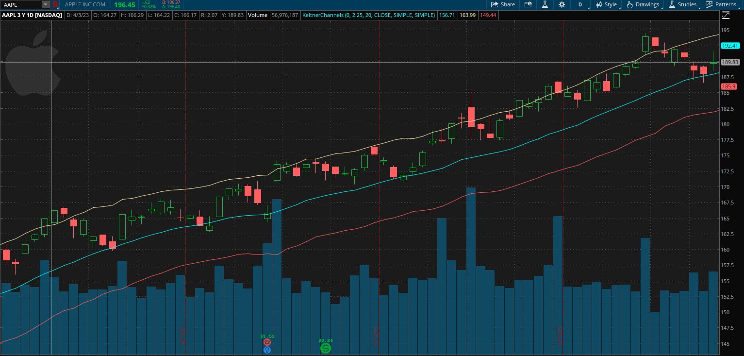 In this example, the stock price of Apple was in an uptrend, moving steadily higher and hanging out in the Upper Keltner Channel.