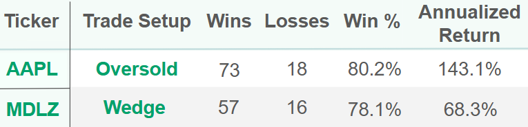 That's what our scanner technology offers. It not only find these swing trading chart patterns in real time, but it also quantifies how successful they've been historically for each stock according to our backtest research.