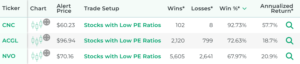*Wins, Losses, Win Percentage, and Annualized Return are referring to how the stock performed in backtests for the Trade Setup indicated.