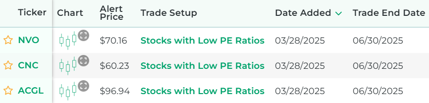 It's powered by our proprietary stock scanner, which searches once per day for blue chip stocks that have low PE ratios.