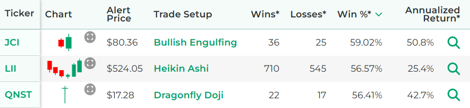 *Wins, Losses, Win Percentage, and Annualized Return are referring to how the stock performed in backtests for the Trade Setup indicated.
