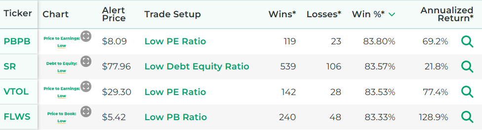 *Wins, Losses, Win Percentage, and Annualized Return are referring to how the stock performed in backtests for the Trade Setup indicated.