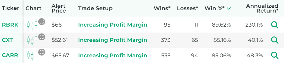*Wins, Losses, Win Percentage, and Annualized Return are referring to how the stock performed in backtests for the Trade Setup indicated.