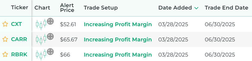 In the case of finding stocks that have increasing profit margins each day, our scanner looks for stocks that, as of the most recent trading day, had higher profit margins than they had the previous quarter.