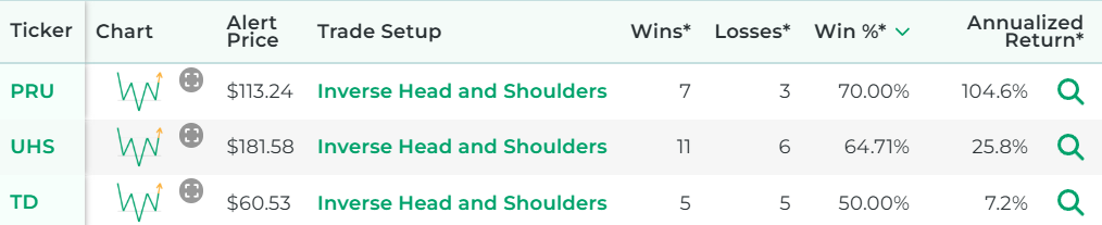 *Wins, Losses, Win Percentage, and Annualized Return are referring to how the stock performed in backtests for the Trade Setup indicated.