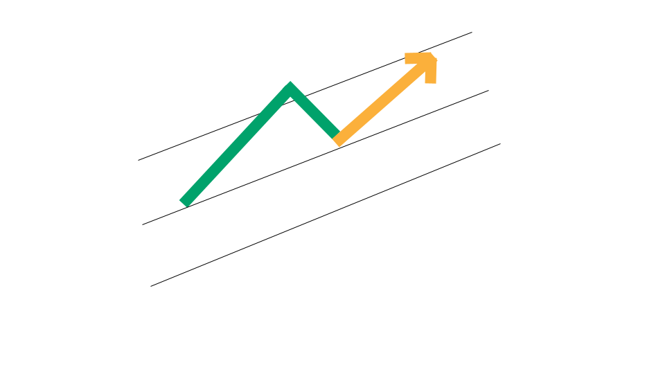 The upper and lower lines are both set at equal distances away from the center line. The distance of those lines is based in the stock's price volatility.