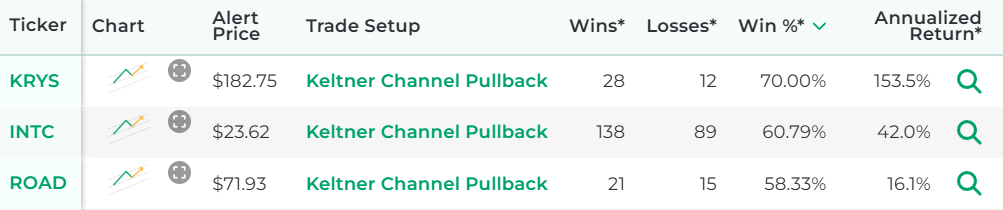 *Wins, Losses, Win Percentage, and Annualized Return are referring to how the stock performed in backtests for the Trade Setup indicated.