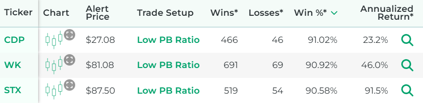 *Wins, Losses, Win Percentage, and Annualized Return are referring to how the stock performed in backtests for the Trade Setup indicated.