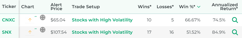*Wins, Losses, Win Percentage, and Annualized Return are referring to how the stock performed in backtests for the Trade Setup indicated.