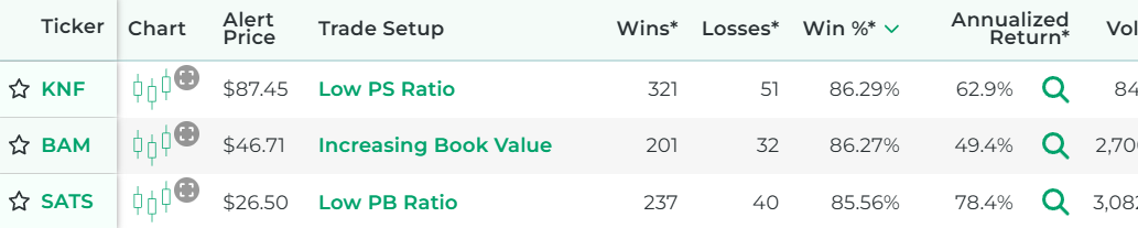 Subscribers can see all stock scan results at once and sort by the ones that have the best backtested performance. But we also cater to a variety of different ways to search and filter stocks.