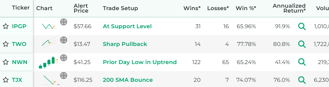 Our stock scanner shows you the historical performance of every trade setup it finds.